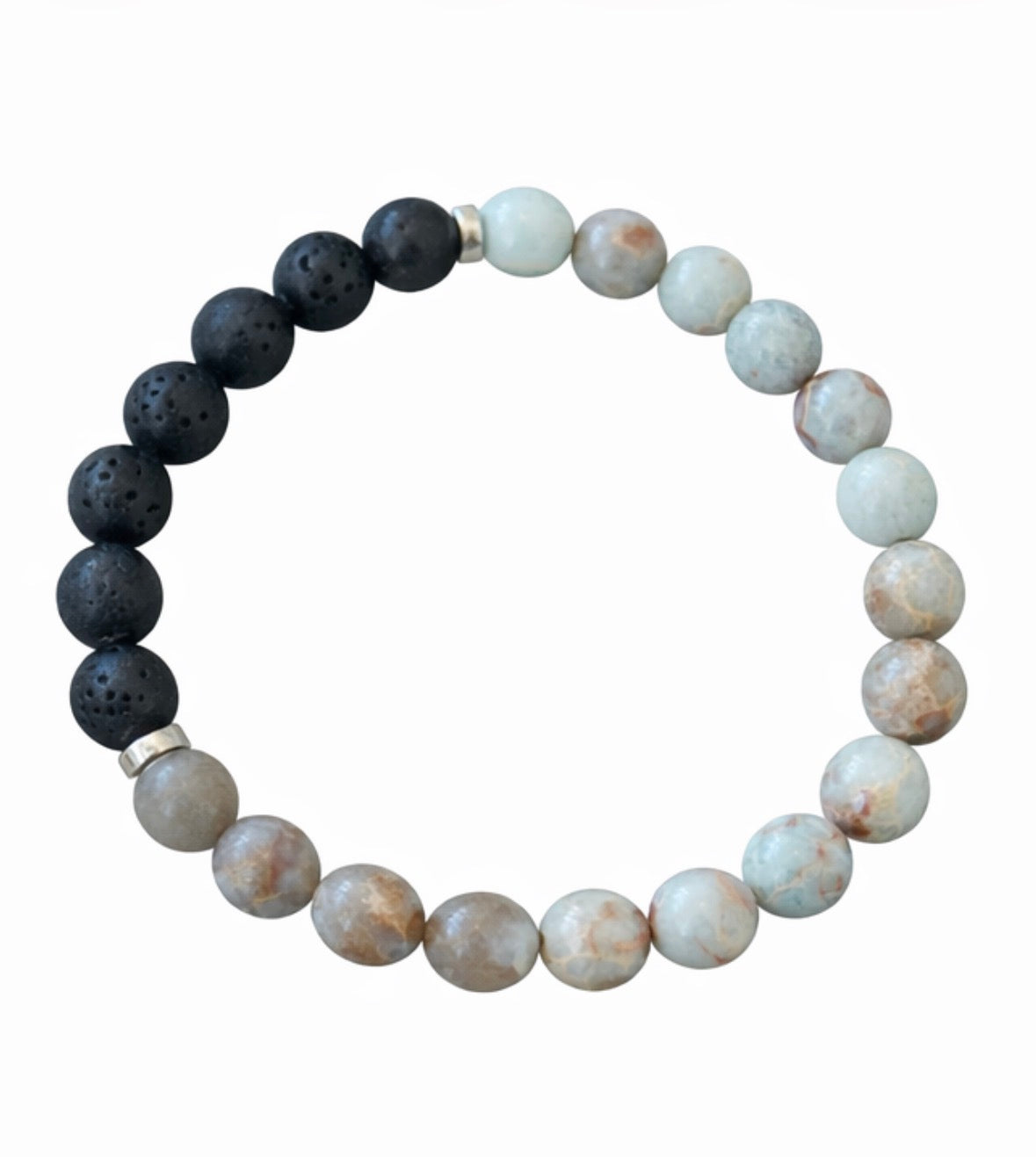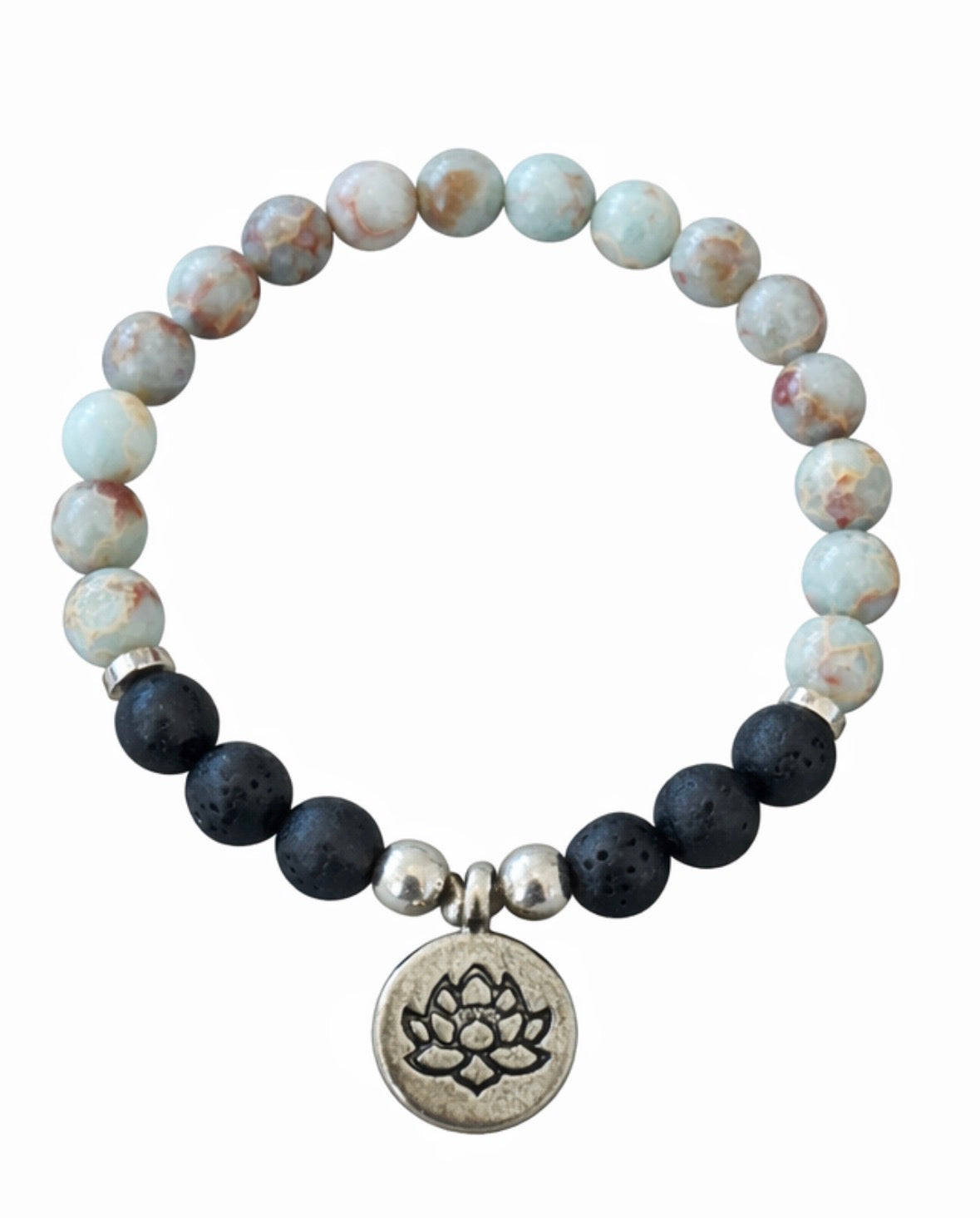 Embrace the calming energy and the benefits of aromatherapy with our Ocean Jasper Lava Diffuser Bracelet. This beautiful piece features: