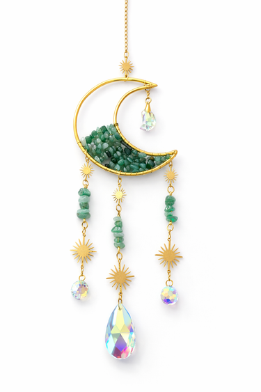 Catch the light with this enchanting crescent moon suncatcher, adorned with natural green aventurine crystals that sparkle and dance across your space. Each piece features iridescent gemstone accents that refract sunlight into warm, golden hues, creating a mesmerizing play of light and shadow. Perfect for windows, meditation spaces, or as a thoughtful gift for crystal lovers. Handcrafted with care to bring celestial beauty and positive energy into your home.